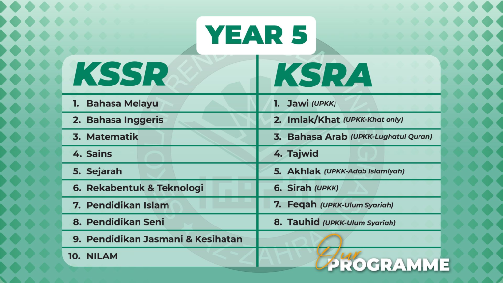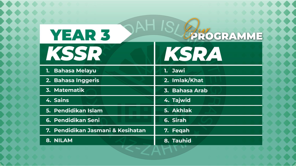 At Az-Zahra Primary Islamic Integrated School, we offer more than just education — we provide a nurturing foundation for life. As a fully registered school under the Ministry of Education (KPM) and Jabatan Agama Islam Selangor (JAIS), our integrated approach combines the Kurikulum Standard Sekolah Rendah (KSSR) with the Kurikulum Sekolah Rendah Agama (KSRA), ensuring students thrive in both academic achievement and spiritual growth.